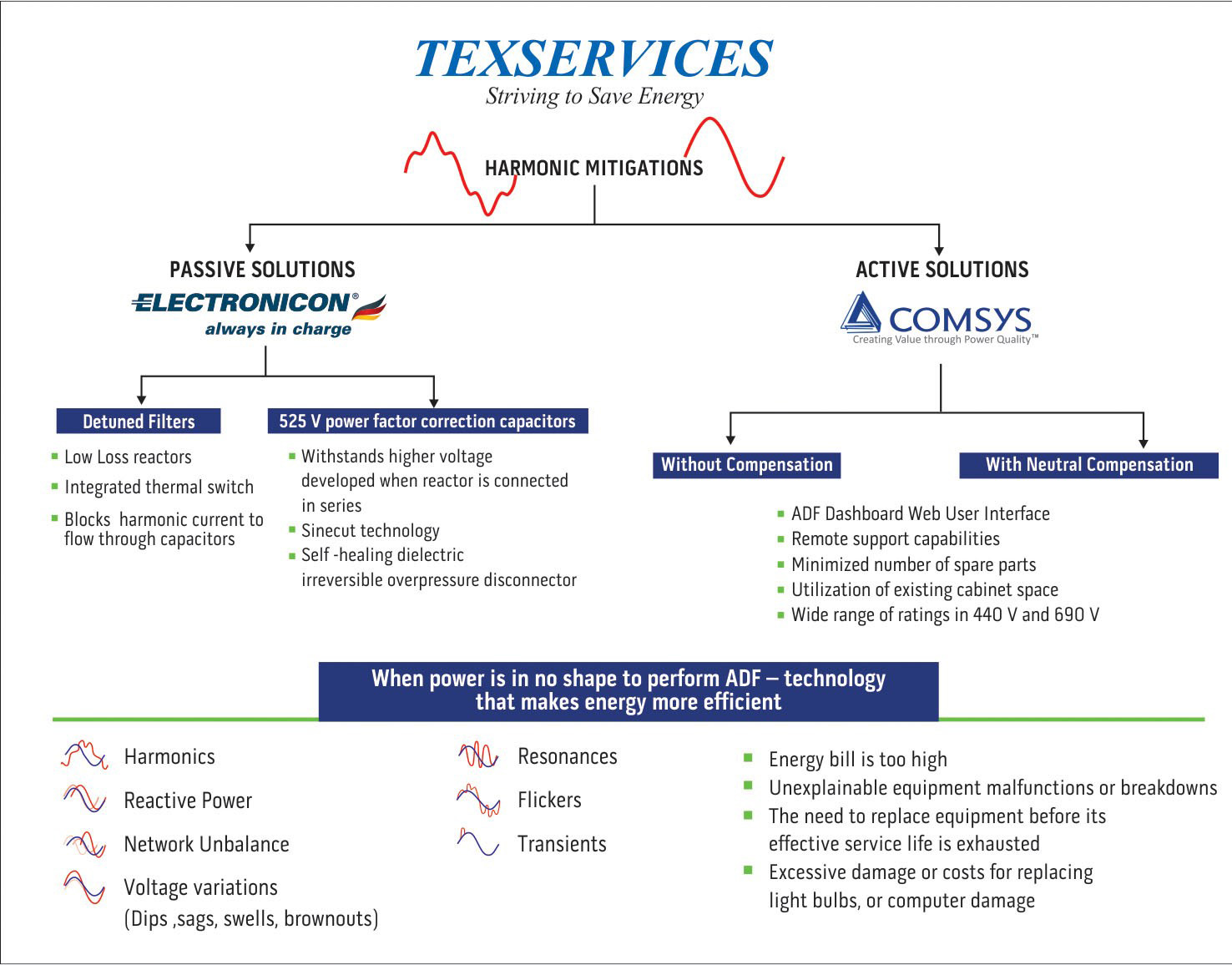 TEXSERVICES conducts power quality study with high end fluke 435 series II harmonic meter and offer passive solutions with ELECTRONICON - German make reactors and capacitors and active solutions with COMSYS - Sweden make active filters.